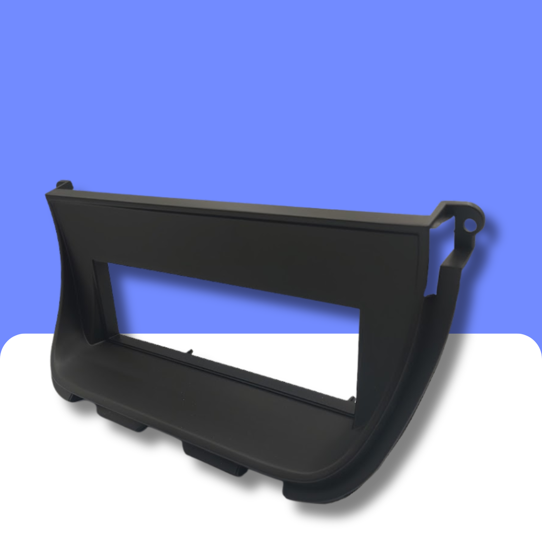 Car radio fascia adapter panel to allow the fitting of an aftermarket Single DIN car radio upgrade.