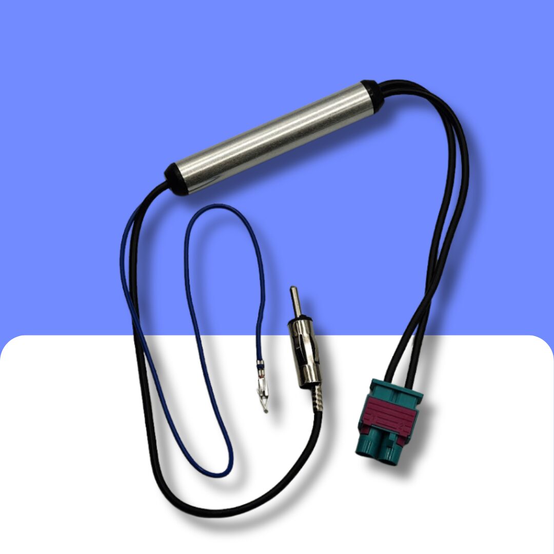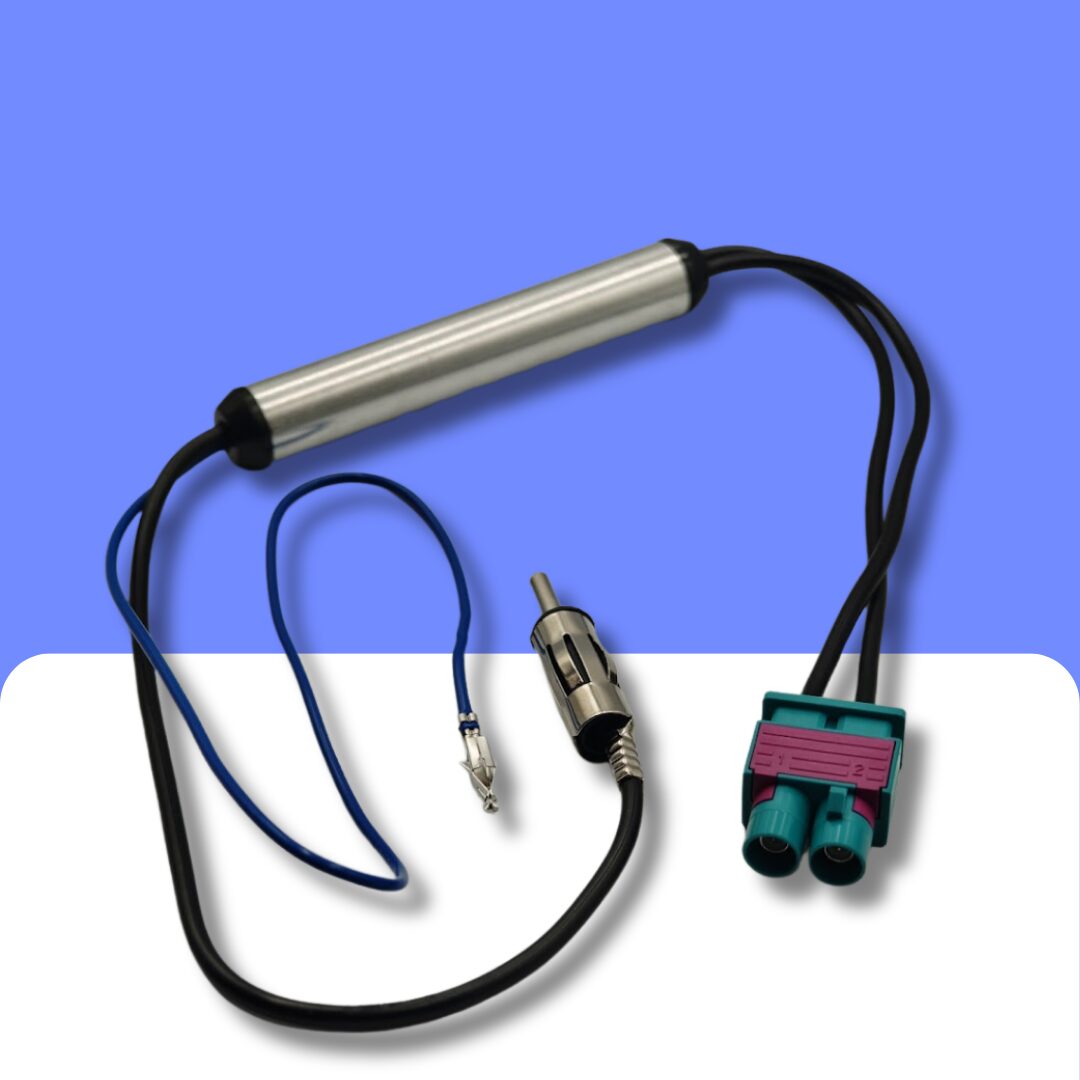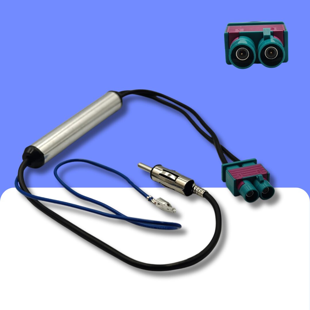 This cable adapts from a Double Fakra antenna connection at the back of the cars original radio to a standard aftermarket DIN antenna connection to allow the fitting of an aftermarket radio upgrade. This adapter is suitable for cars with original aerials with an amplifier powered by a 12v supply that is sent up the centre of the antenna cable.