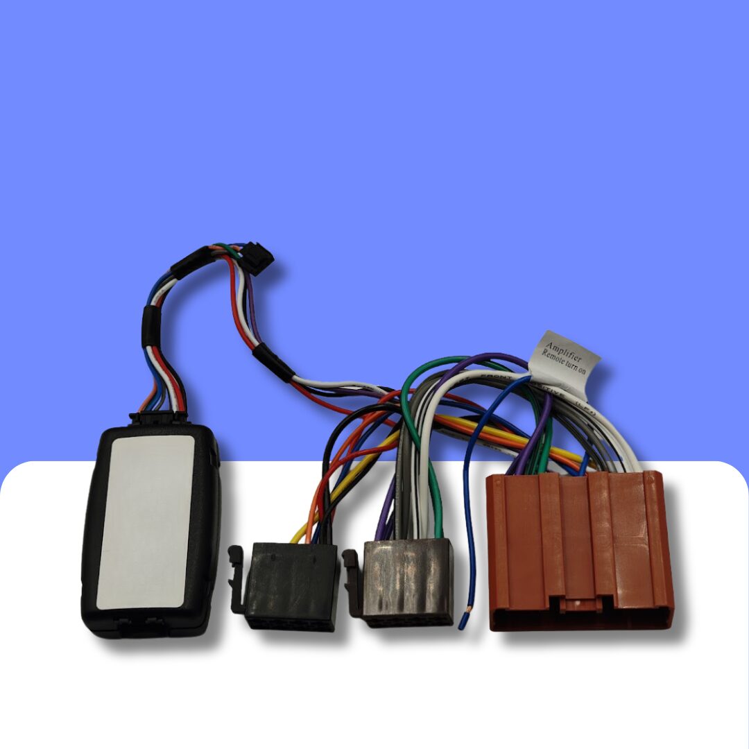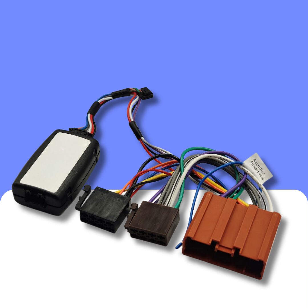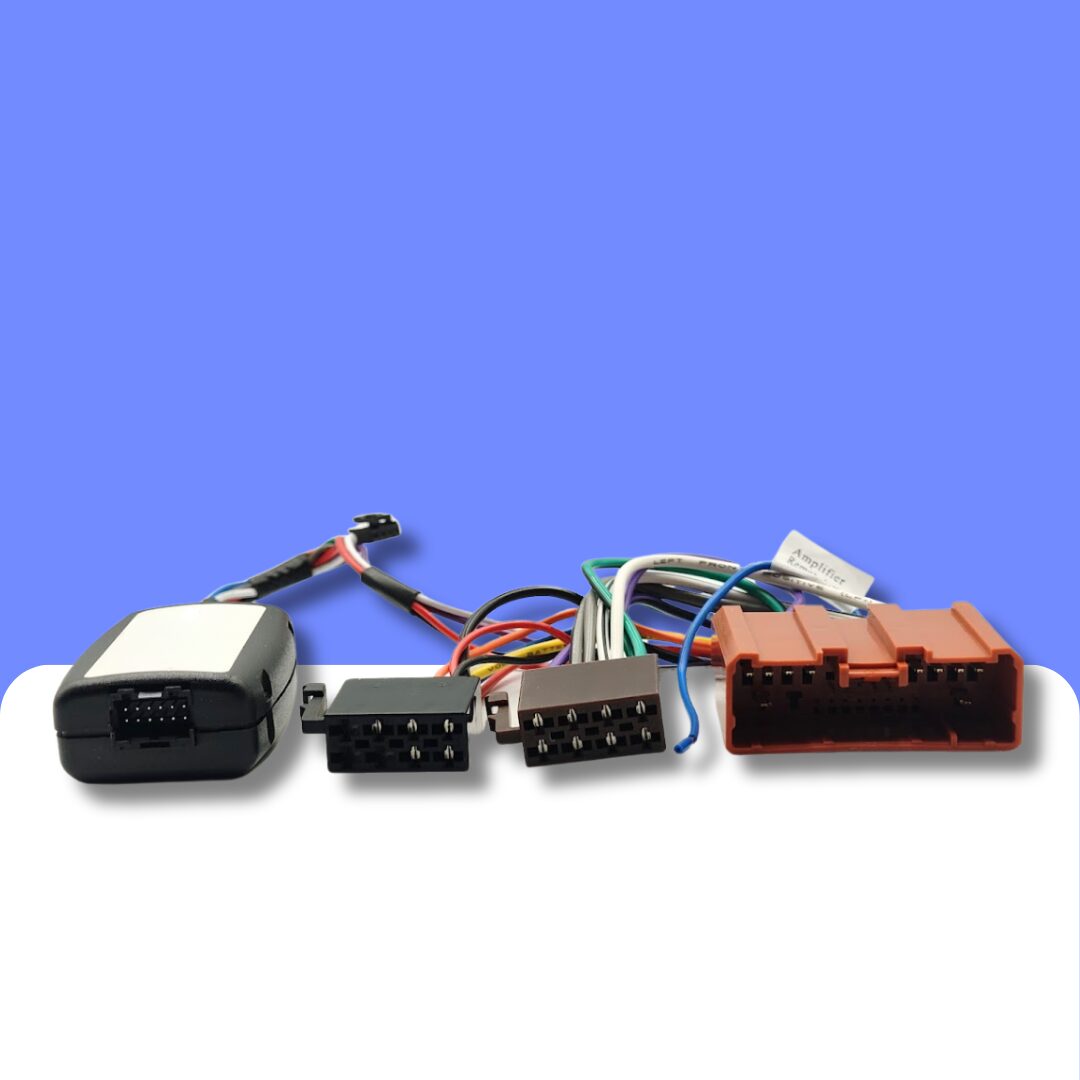 Interface and ISO cables allowing use of original steering wheel control buttons with a new aftermarket radio head-unit.