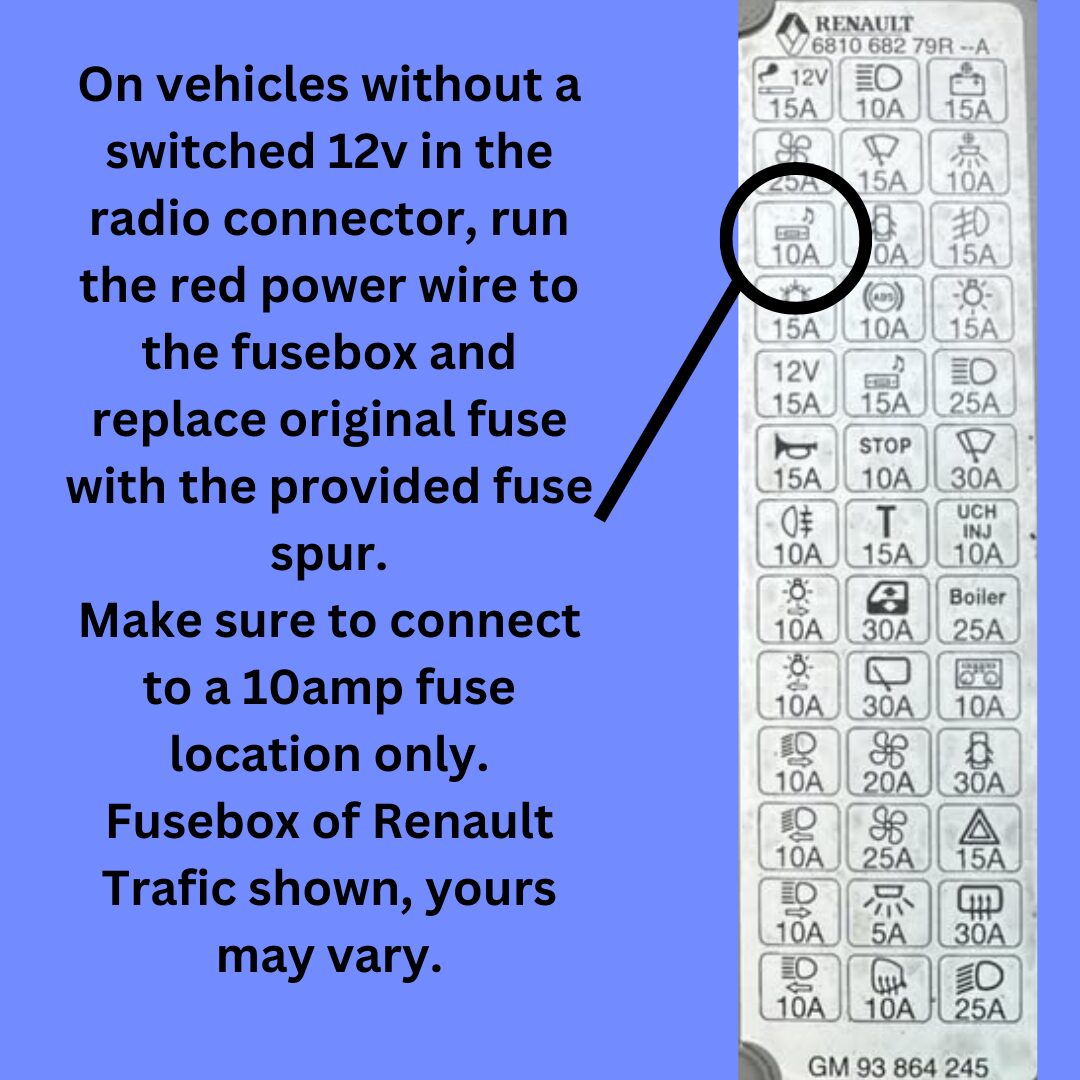 For fitting an aftermarket car radio to various Renault cars and vans built from 2001 ISO connectors for the radio. This cable includes a fused power cable that can be run to the fuse box on vehicles without a switched live in the original radio wiring, keeping the installation as close to plug and play as possible without having to cut into original wiring. Please check the compatibility list carefully, including the original radio type before ordering for these vehicles.